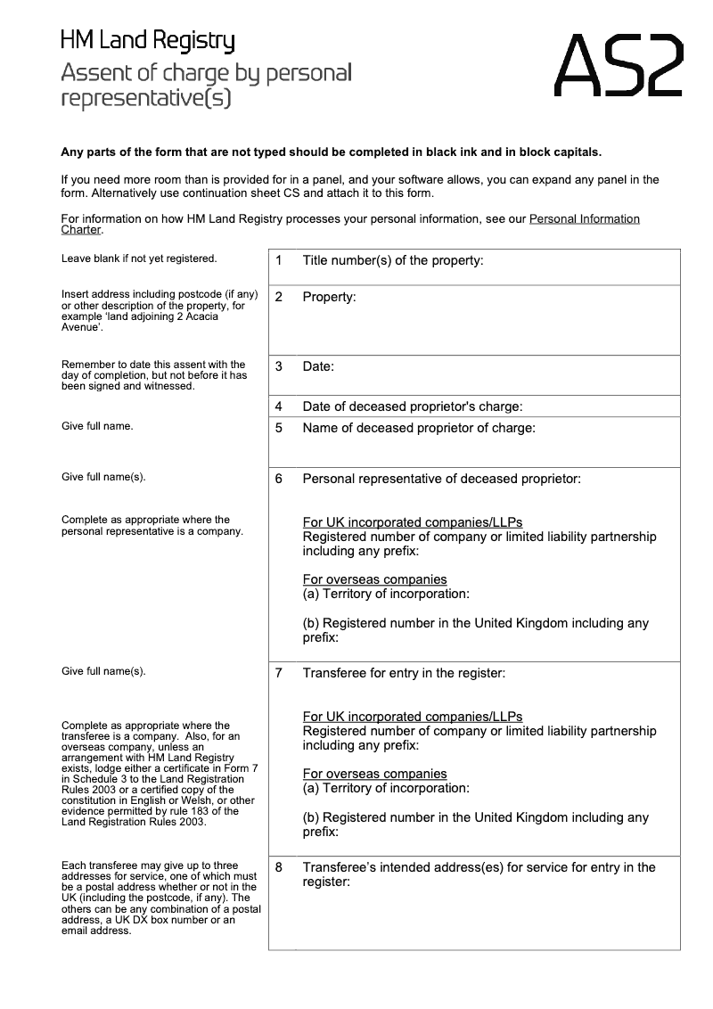 Assent of charge by personal representative(s)