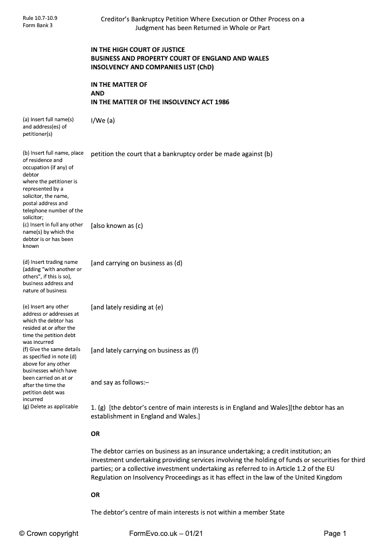 Creditor’s Bankruptcy Petition Where Execution or Other Process on a Judgment has been Returned in Whole or Part