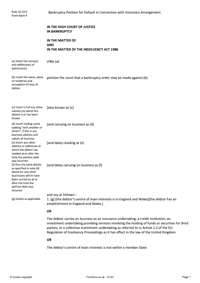 Bankruptcy Petition for Default in Connection with Voluntary Arrangement