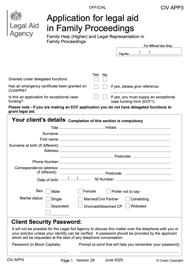 Application for legal aid in Family Proceedings - Family Help (Higher) and Legal Representation in Family Proceedings