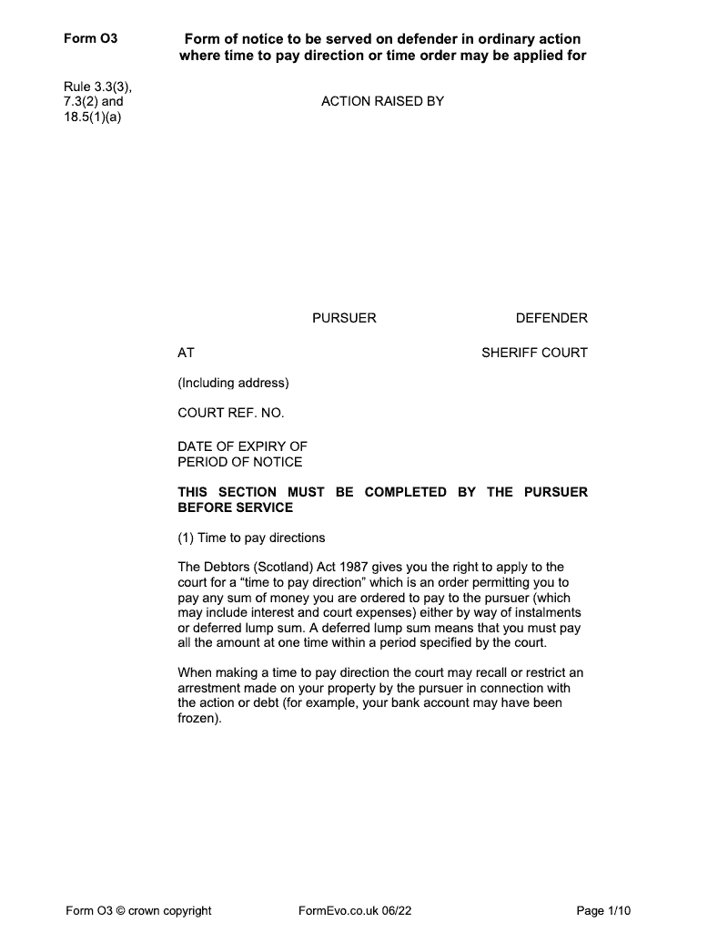 Form of notice to be served on defender in ordinary action where time to pay direction or time order may be applied for - electronic signature available