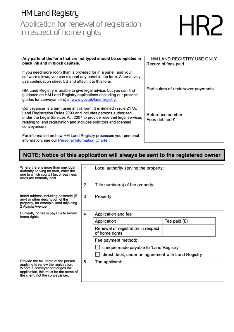 Application for renewal of registration in respect of home rights
