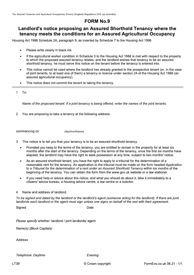 Landlord's notice proposing an Assured Shorthold Tenancy where the tenancy meets the conditions for an Assured Agricultural Occupancy (Form 9) [LTA9, HA38]