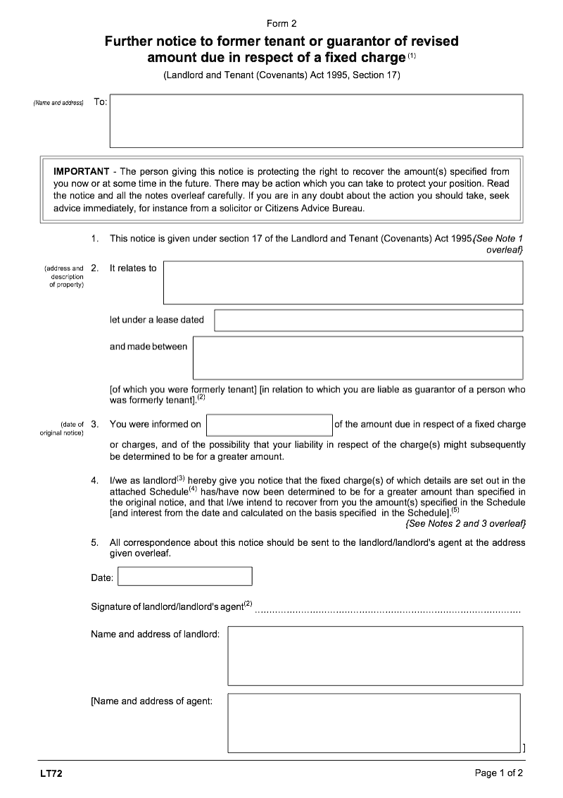Further notice to former tenant or guarantor of revised amount due in respect of a fixed charge (Landlord and Tenant (Covenants) Act 1995, Section 17) (Form 2)
