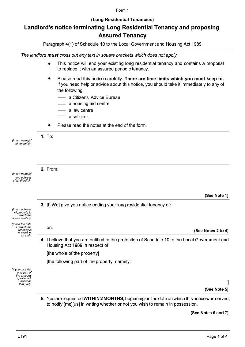 Landlord's notice terminating Long Residential Tenancy and proposing Assured Tenancy (Local Government and Housing Act 1989 paragraph 4(1) of schedule 10) (Form 1)