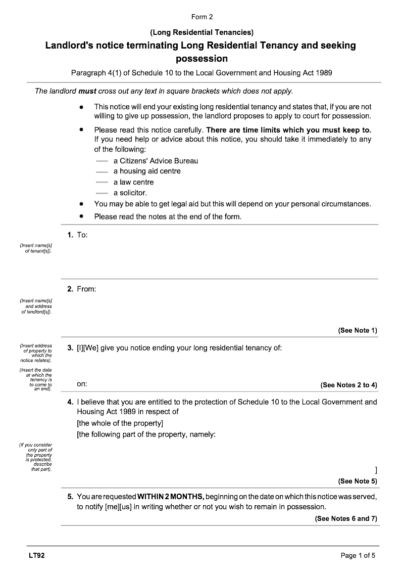 Landlord's notice terminating Long Residential Tenancy and seeking possession (Local Government and Housing Act 1989 paragraph 4(1) of schedule 10) (Form 2)