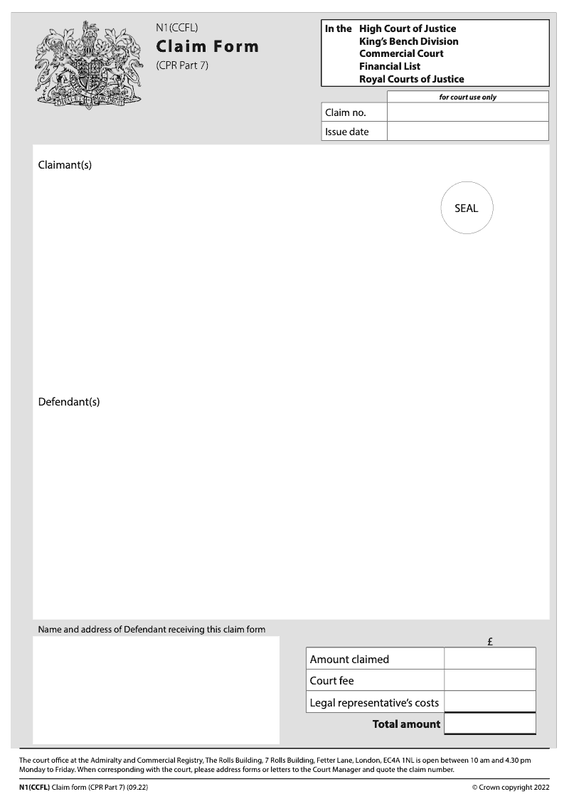 Claim form for the Financial List (CPR Part 7) (Commercial Court)