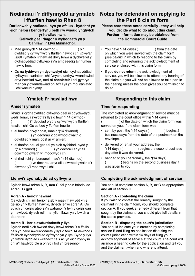 Nodiadau i’r diffynnydd ar ymateb i ffurflen hawlio Rhan 8 (Llys Masnachol)/Notes for defendant on replying to the Part 8 claim form (Commercial Court)
