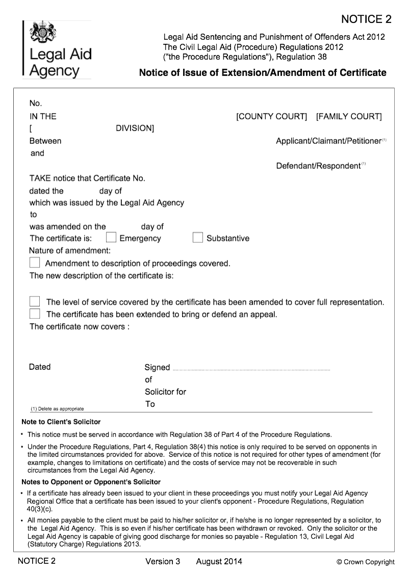 Notice of issue of extension/amendment of certificate (The Civil Legal Aid (Procedure) Regulations 2012, Regulation 38)