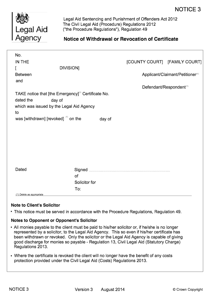 Notice of withdrawal or revocation of certificate (The Civil Legal Aid (Procedure) Regulations 2012, Regulation 49)