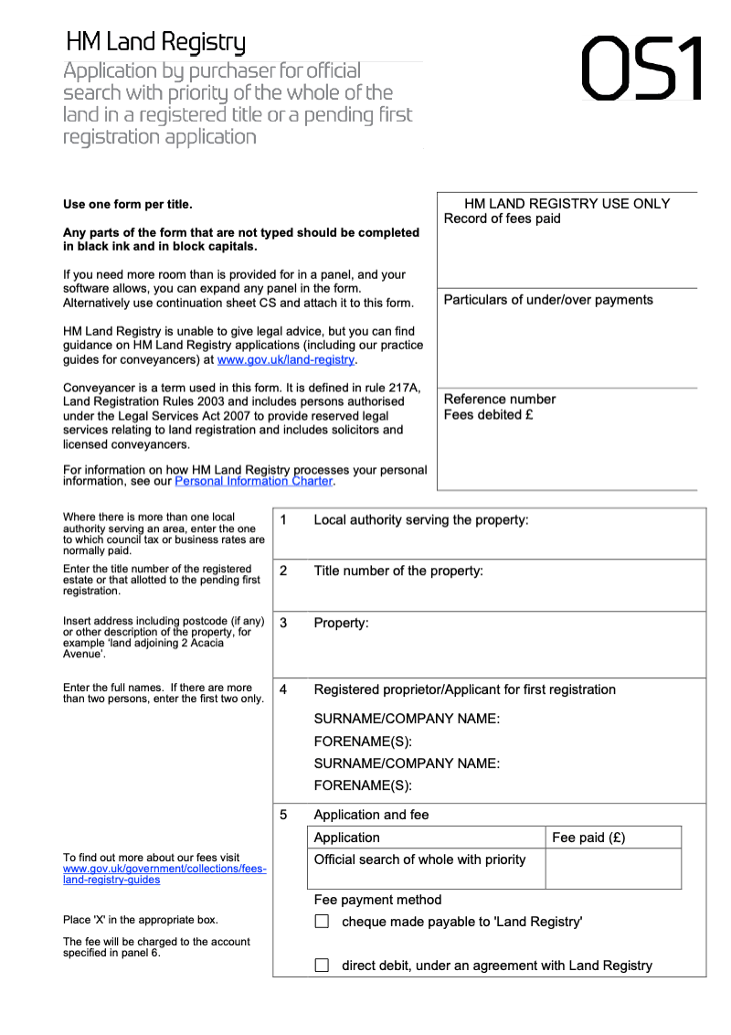 Application by purchaser for official search with priority of the whole of the land in registered title or a pending first registration application