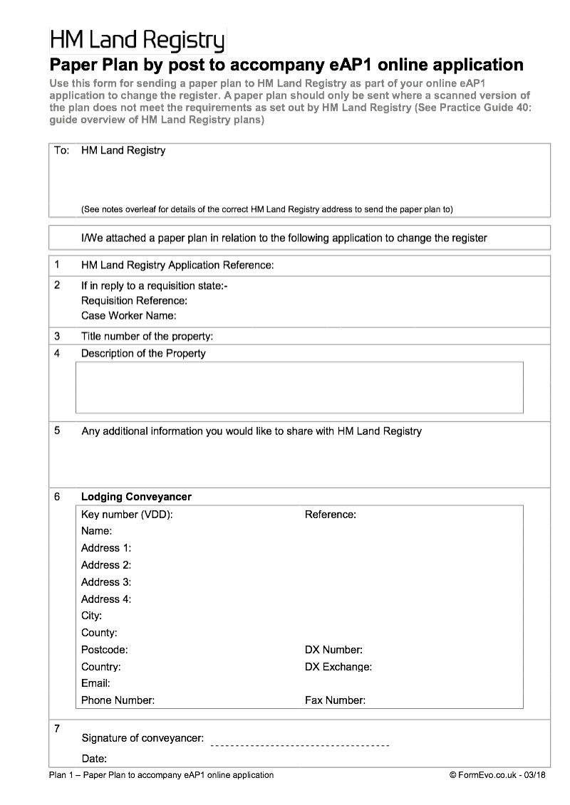 Paper plan sent by post or DX to HM Land Registry to accompany an online application to change the register - eAP1 (online submissions only)
