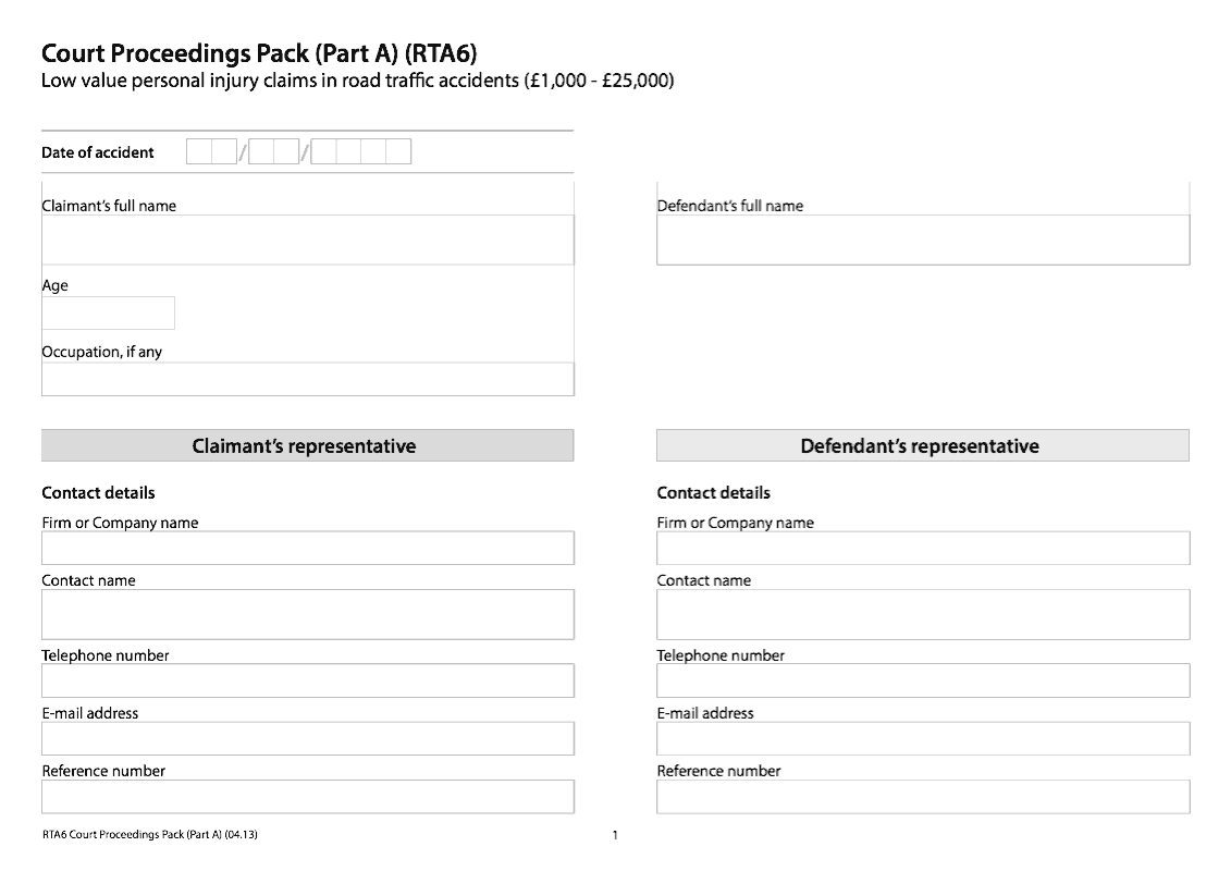 Court Proceedings Pack (Part A) (RTA6) and (Part B) (RTA7) Low value personal injury claims in road traffic accidents (£1,000 - £25,000)
