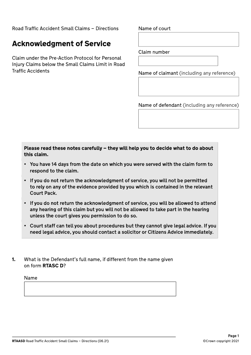 Acknowledgment of Service - (RTA Small Claims - Directions). Claim under the Pre-Action Protocol for Personal Injury Claims below the Small Claims Limit in Road Traffic Accidents)