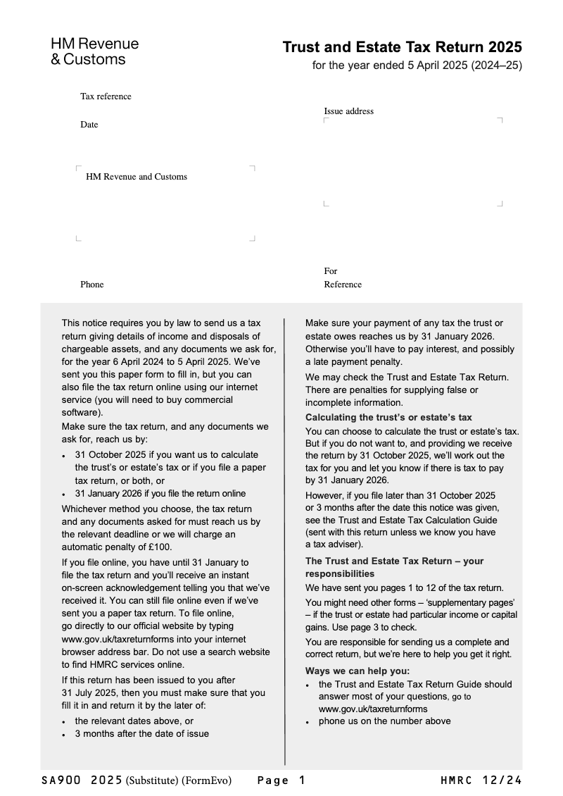 Trust and Estate Tax Return 2025 for year ended 5 April 2025 (2024-25)
