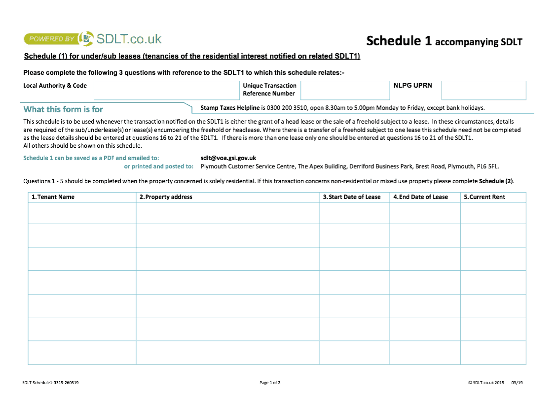 Schedule (1) for under/sub leases (tenancies of the residential interest notified on related SDLT1)