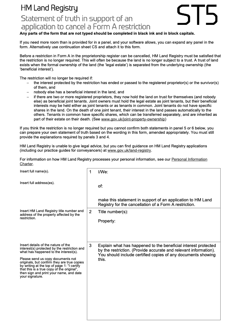 Statement of truth in support of an application to cancel a Form A restriction - Word Version