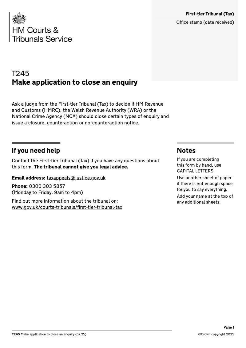 Application to Close Enquiry - First-tier Tribunal Tax Chamber - electronic signature available