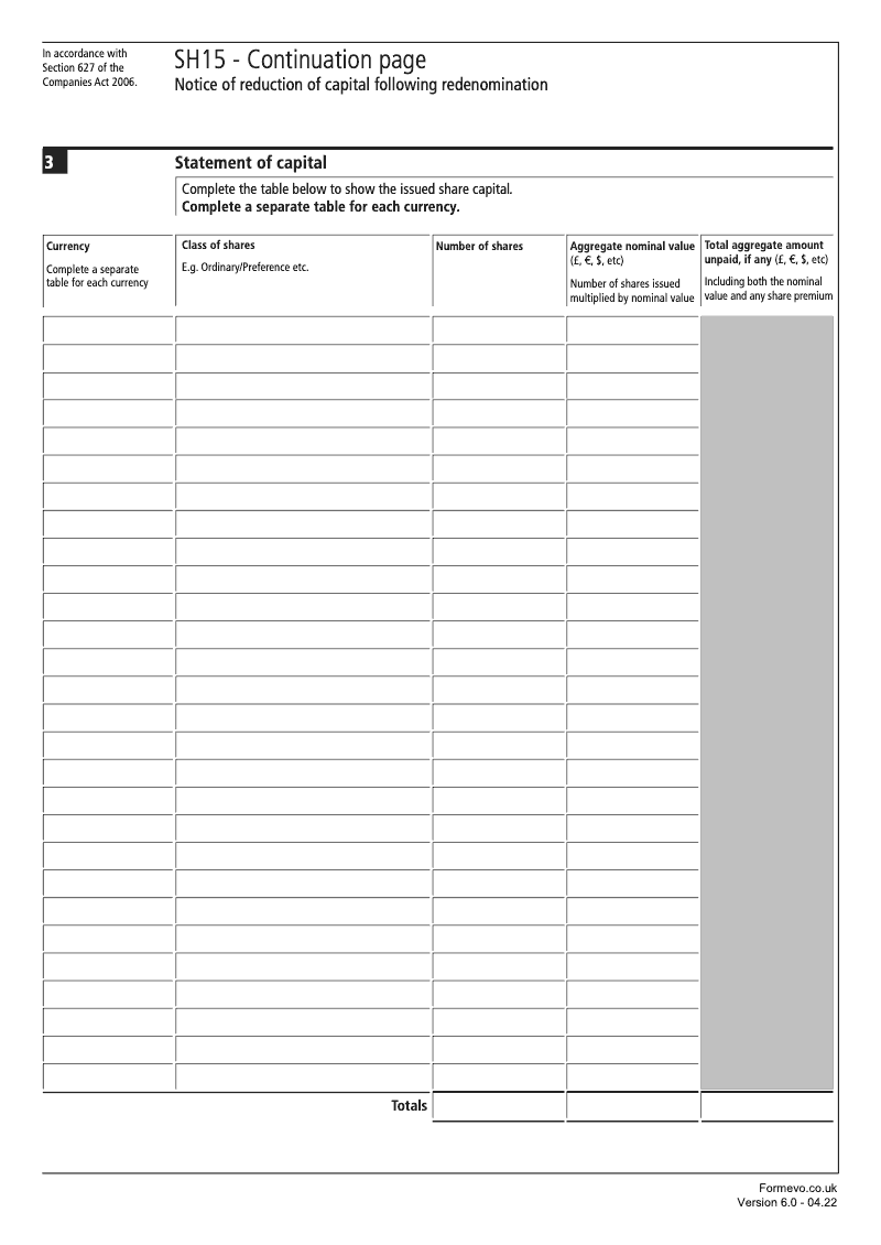 Statement of capital continuation page - SH15 Notice of reduction of capital following redenomination (Section 627)