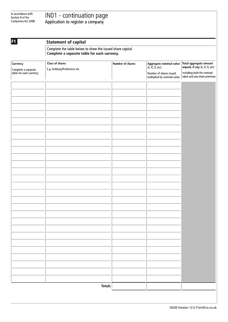 Statement of capital continuation page - IN01 Application to register a company (Section 9)